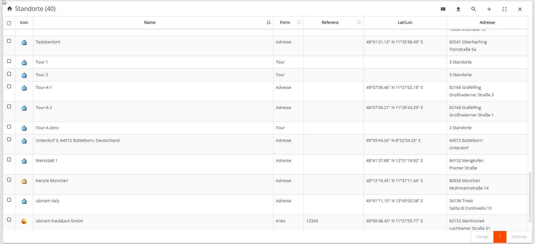 Das Standortmodul dient der Verwaltung von Adressen, Touren, Kreisen und Rechtecke (Geofences). Es zeigt eine Übersicht aller gespeicherten Standorte sowie deren Typ und Position.