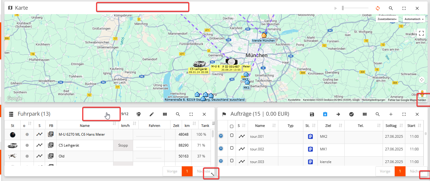 Die Benutzeroberfläche besteht aus einzelnen Fenstern / Modulen wie Karte, Fuhrpark oder Aufträge. Diese Fenster lassen sich individuell verschieben und in ihrer Größe anpassen, um die Ansicht optimal auf die Arbeitsweise abzustimmen.